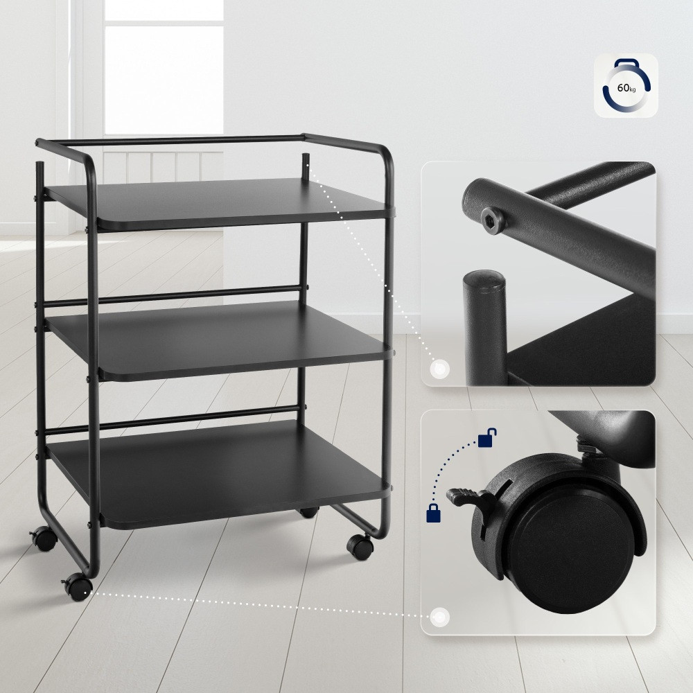 Lydløs Mobilitet: Vognen er udstyret med fire letkørende hjul, der glider ubesværet over både hårde gulve og tæpper. Det gør det muligt at flytte dit udstyr lydløst og præcist under behandlingen.